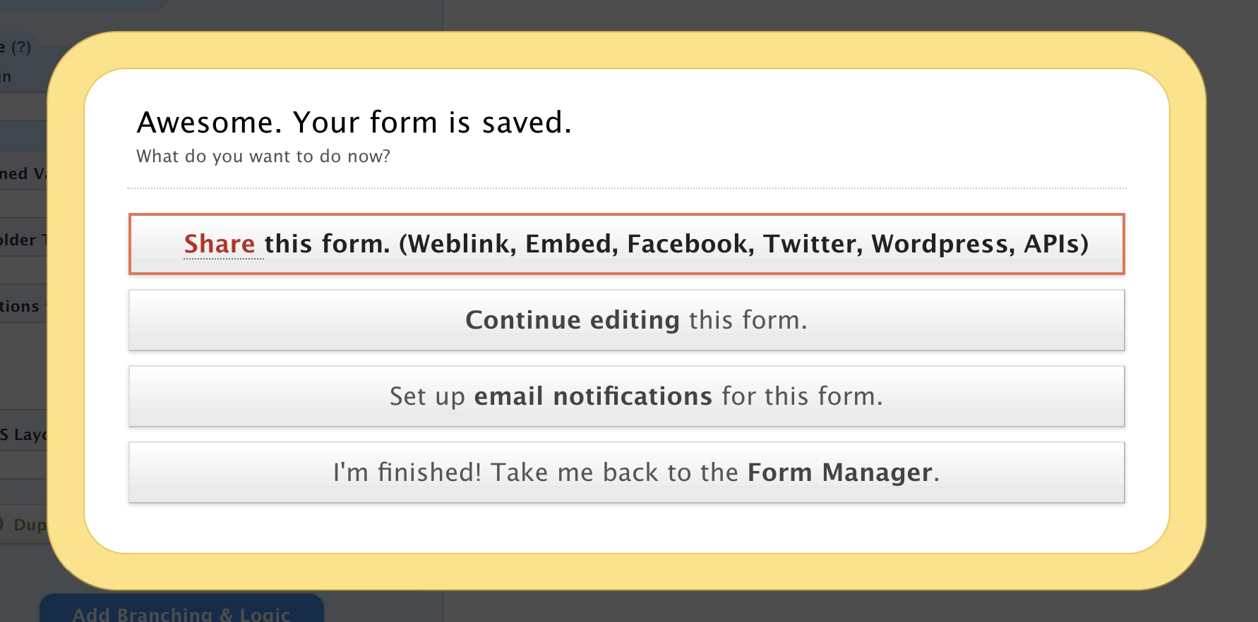 Once you’ve set up your new form and you’re happy with all of the fields, press the Save button and you’ll be prompted for what to do next. Select: Share